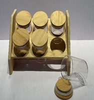 Juego de 6 tarros de especias de vidrio transparente con estante de madera, recipientes herméticos para condimentos para almacenamiento de cocina de sal, azúcar y hierbas